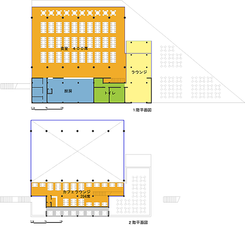 火気使用のキッチンエリアは耐火性能のある構造体として計画し、 学生食堂の部分はフレキシブルな使用が可能で、 工期も短い、テント膜構造の計画としました。